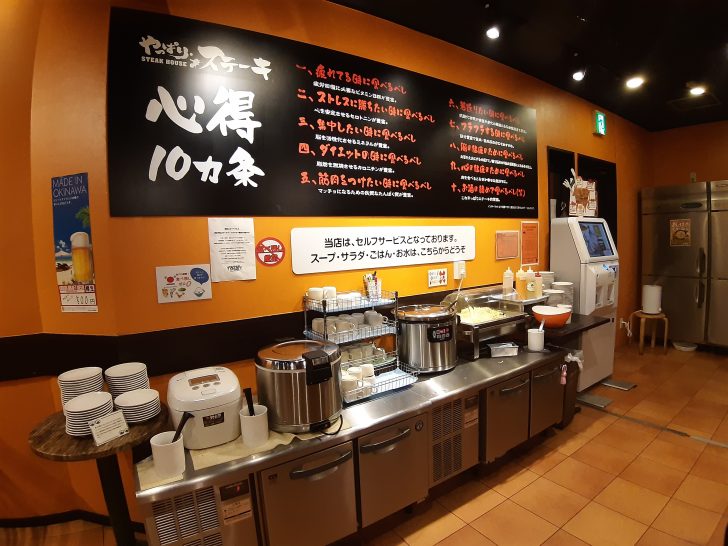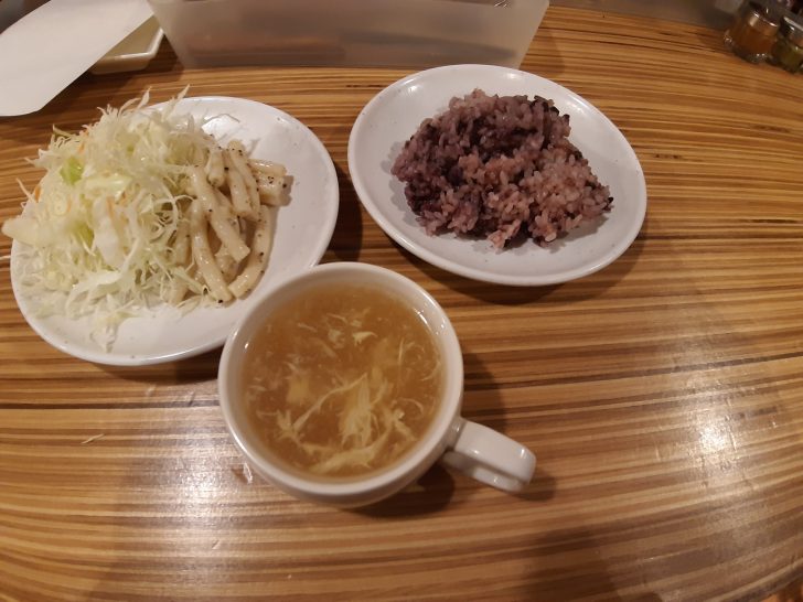 スープ、サラダ、ごはん、水はセルフサービスとなっていてお替り自由です。