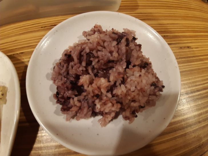 赤身ステーキ(200g)を注文しましたが、料理が来るまでは、お替り自由のサラダ(キャベツ、マカロニ)、ごはん、スープを先に取りに行って食べます。ごはんは、普通の白米と古代米の2種類があります。私はヘルシーな古代米を頂きました。