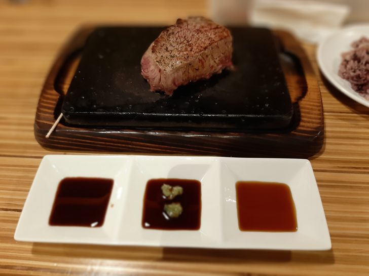お肉はミディアムレアーで提供されるので、もう少し焼きたい場合は、溶岩石のプレートで焼いて食べます。