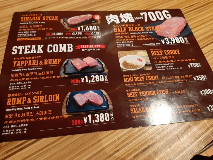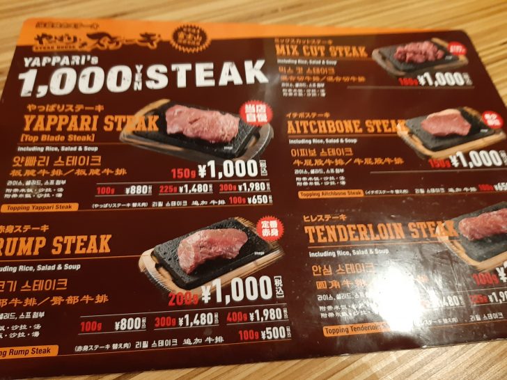 - ステーキ+ライス+サラダ+スープで1000円と激安です。