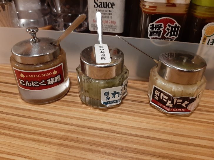にんにく味噌、刻みわさび、刻みにんにくがあります。
