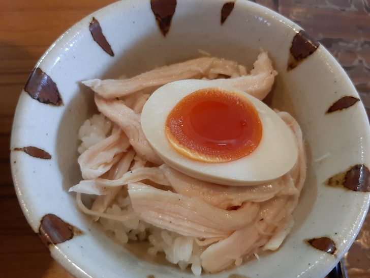 『鶏塩めしミニ』は、低温調理した鶏むね肉に塩味がついて、ごま油が掛けてあります。それに味玉(半分)が載っていますが、これが、本当に美味しいんですね。また、ミニですが、らーめんと一緒に食べるには十分な量だと思います。これで【150円】とは、激安ですね。これだったら、注文しないことは考えらえないですね。