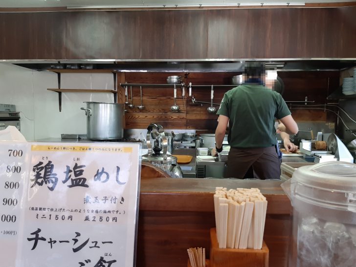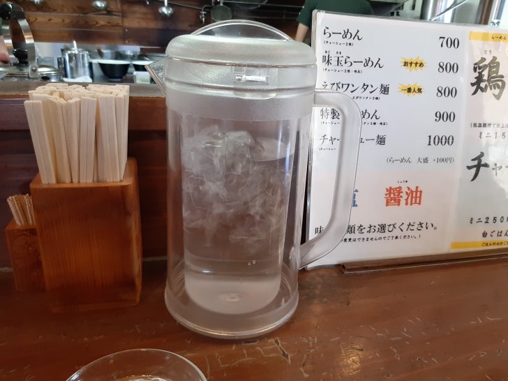 置いてあるのは、メニュー、お冷、割り箸、爪楊枝のみです。卓上調味料が一切ないのは、店主さんのこだわりなのでしょうか?「何も入れないでたべて」ということなのでしょう。