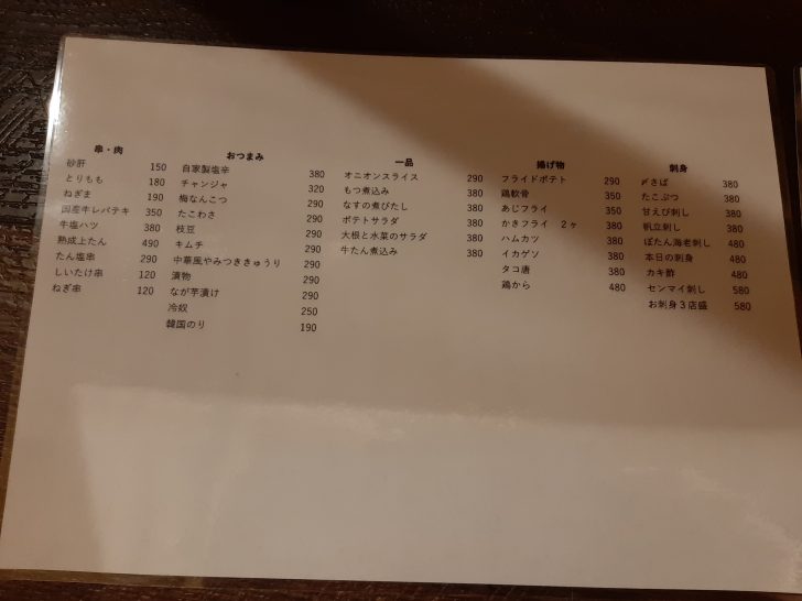 焼鳥等の串焼き、牛たん、牛ハツ、牛レバー肉が、炭火焼きで提供されるようです。他にも刺身、揚物、煮物など、おつまみのメニューは豊富ですね。値段は立呑み屋としては、高めですね。尚、この値段は税抜です。