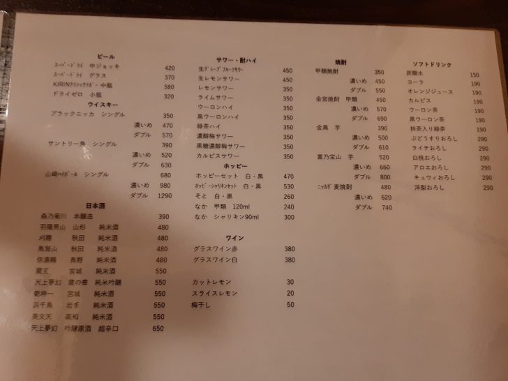 ドリンクメニューは、地元宮城を含めた東北の地酒が多いですね。他はビール、ハイボール、サワー、酎ハイ、ホッピー、焼酎もあります。ドリンク類も値段は高めですね。