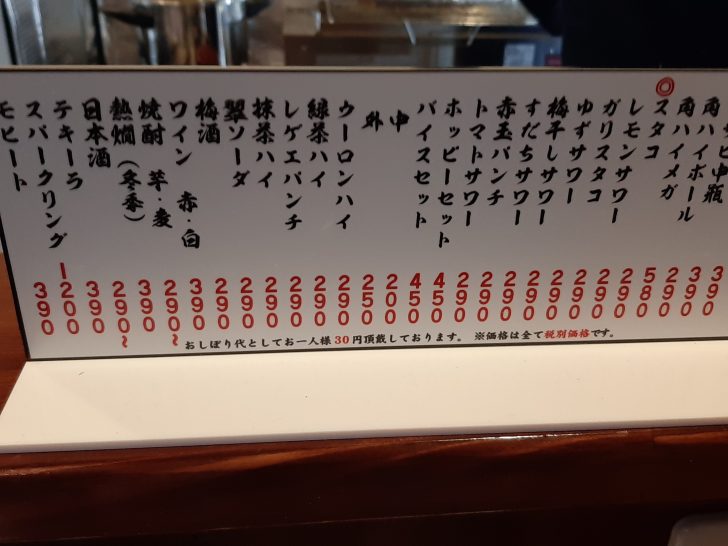 ドリンクメニューも豊富で安めです。但し、この価格は税別価格です。また、おしぼり代(30円/人)取られるようです。