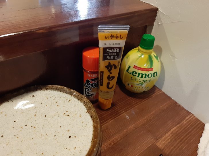 卓上調味料は一味唐辛子、ねりからし、レモン果汁です。