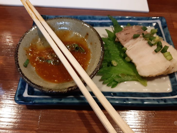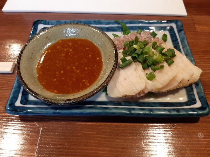 おつまみのひとつめは、おすすめメニューの蒸し豚【290円】を注文しました。これは、蒸し豚を辛めのタレに付けて頂くのですが、絶品ですね。蒸し豚の塊肉を注文を受けてからスライスしていましたので、切りたてだから美味しいんですかね。