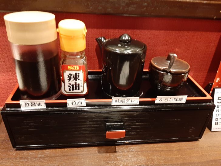 卓上調味料は、酢醤油、ラー油、味噌ダレ、からし味噌ですね。