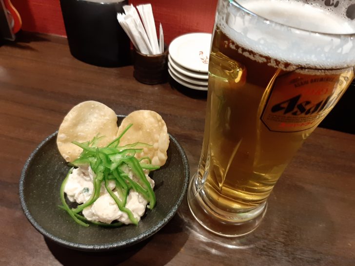 今日もちょい呑みなので、「お気軽セット」を注文。これは、『チャチャオ餃子』2枚とあつまみ1品、生ビール(中)1杯のセットになっています。早速生ビールが提供されました。おつまみは「鯖ポテトサラダ」を注文しました。