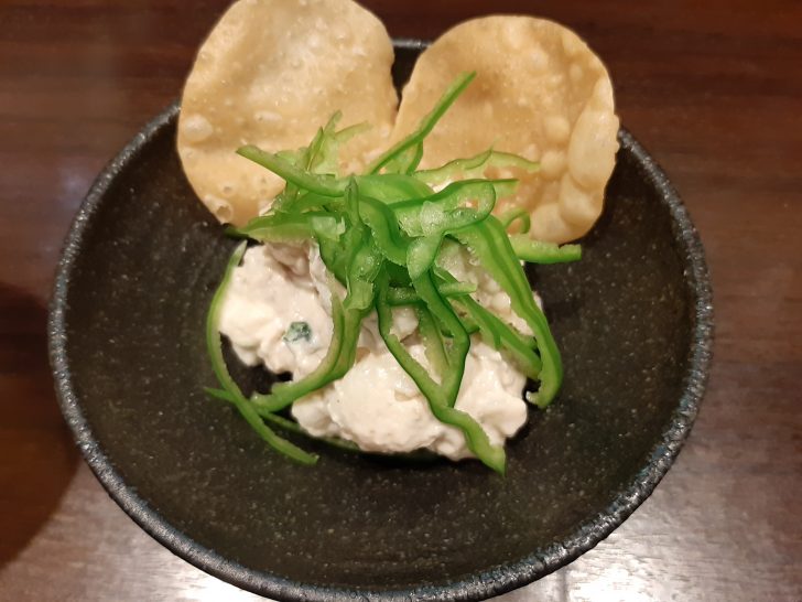 これが、「鯖ポテトサラダ」ですが、これは美味しかったですね。ツナの代わりに鯖が入っている感じです。ピーマンの千切りが載っているのもGOODでした。煎餅みたいな物が2添えられていました。ビジュアル的には良いですが、あまり美味しくはなかったですね。これは一口餃子の皮を揚げたものなんですかね?