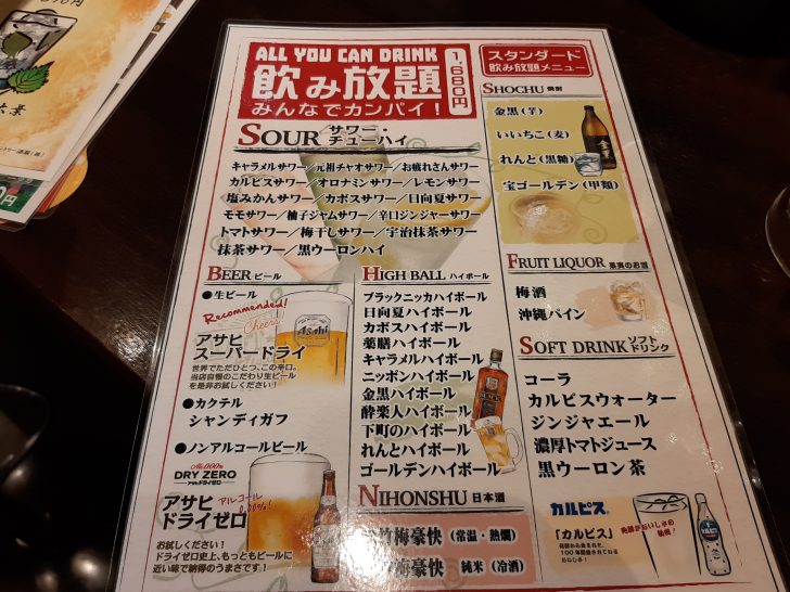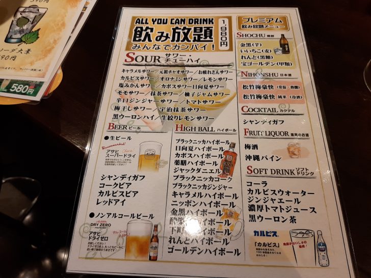 こちらはプレミアム飲み放題メニュー【1980円】です。何が違うのか分かりにくいですが、生絞りレモンサワー、コークビア、カルピスビア、レッドアイが飲めることみたいですね。