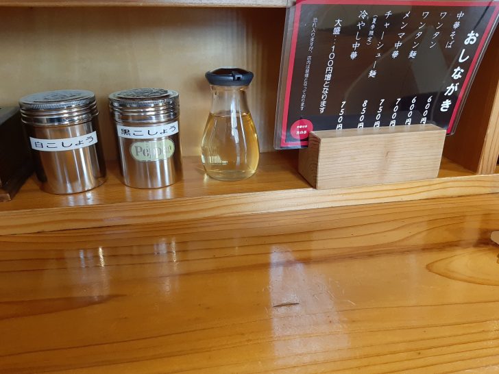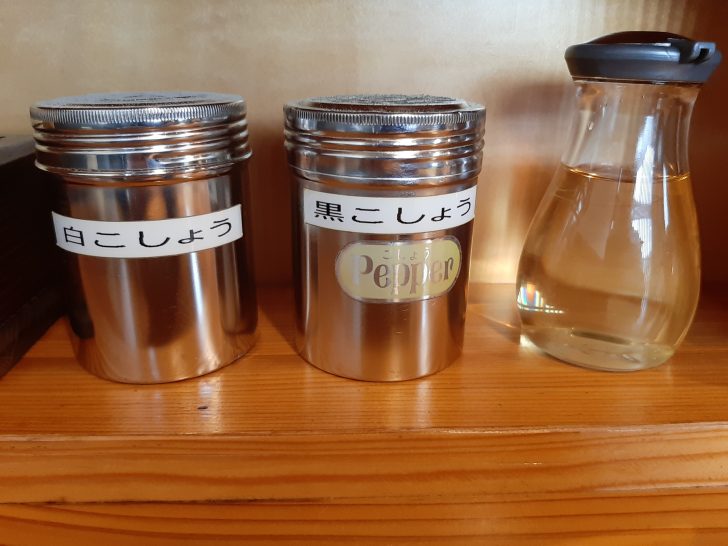 卓上調味料は、白こしょう、黒こしょう、酢ですね。