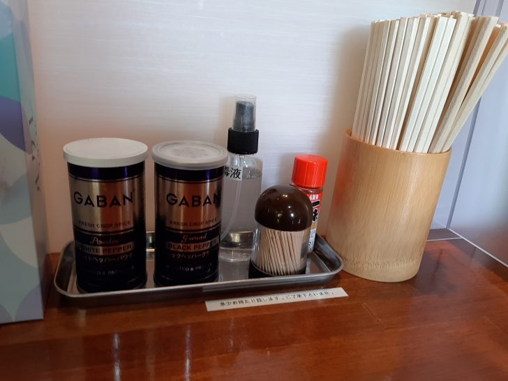 卓上調味料は、白こしょう、黒こしょう、一味唐辛子ですね。