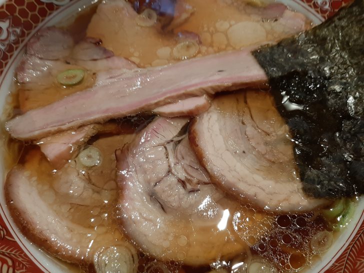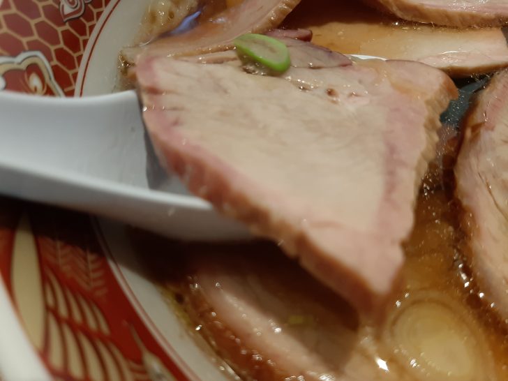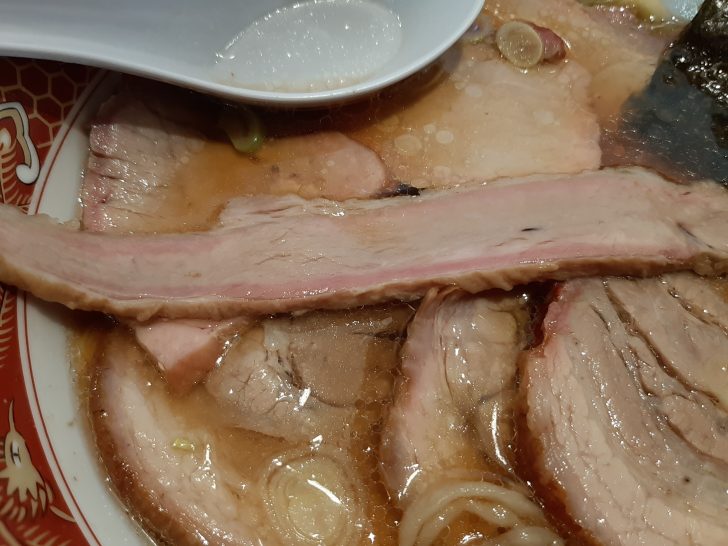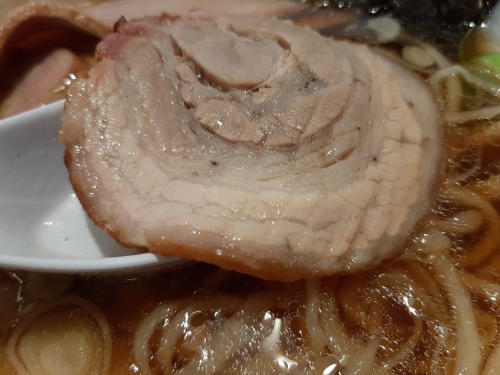 豚バラのチャーシューは、大きめで厚さもあります。ほろほろと柔らかくて、味付けも良く、抜群に美味しいです。