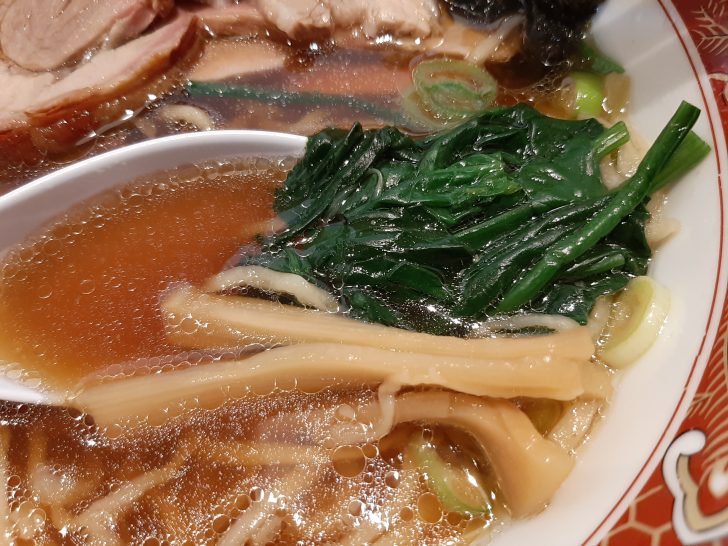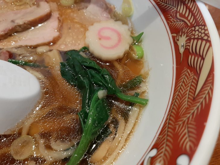 チャーシューをどかすとトッピングが見えてきました。チャーシューの他には、海苔、ほうれん草、メンマ、ナルト、ネギが載っていました。