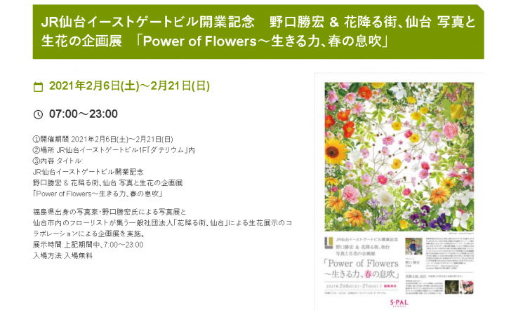 この日からJR仙台イーストビル開業記念のイベントが始まっていました。イベント内容は、福島出身の写真家『野口勝宏』氏の写真展及び『花降る街、仙台』による生花展示のコラボレーション企画展【Power of Flowers~生きる力、春の息吹】ですね。展示期間は、2月6日~2月21日、展示時間は7:00~23:00で、入場無料です。