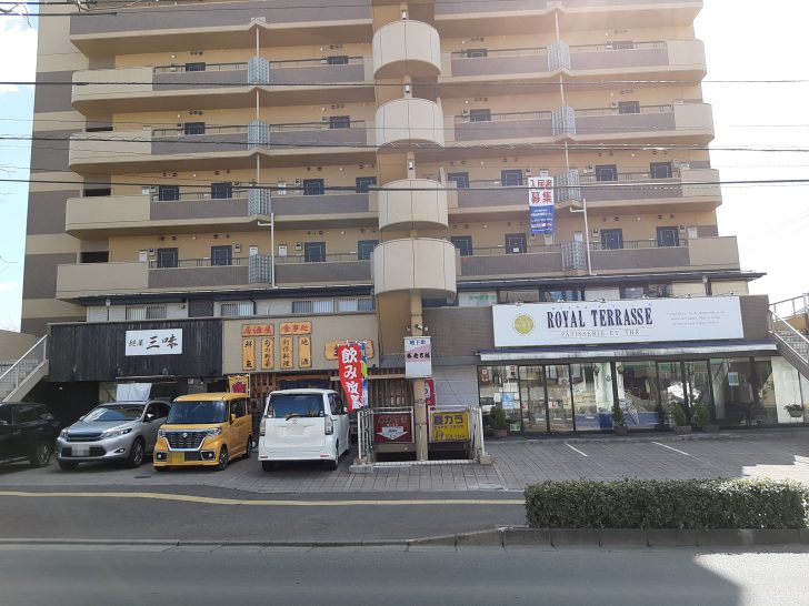 お店は、マンション(パレスピジョン)の1Fにあります。同じ1Fには、洋菓子のロワイヤルテラッセ、居酒屋まといがあり、地下には養老乃瀧もあります。