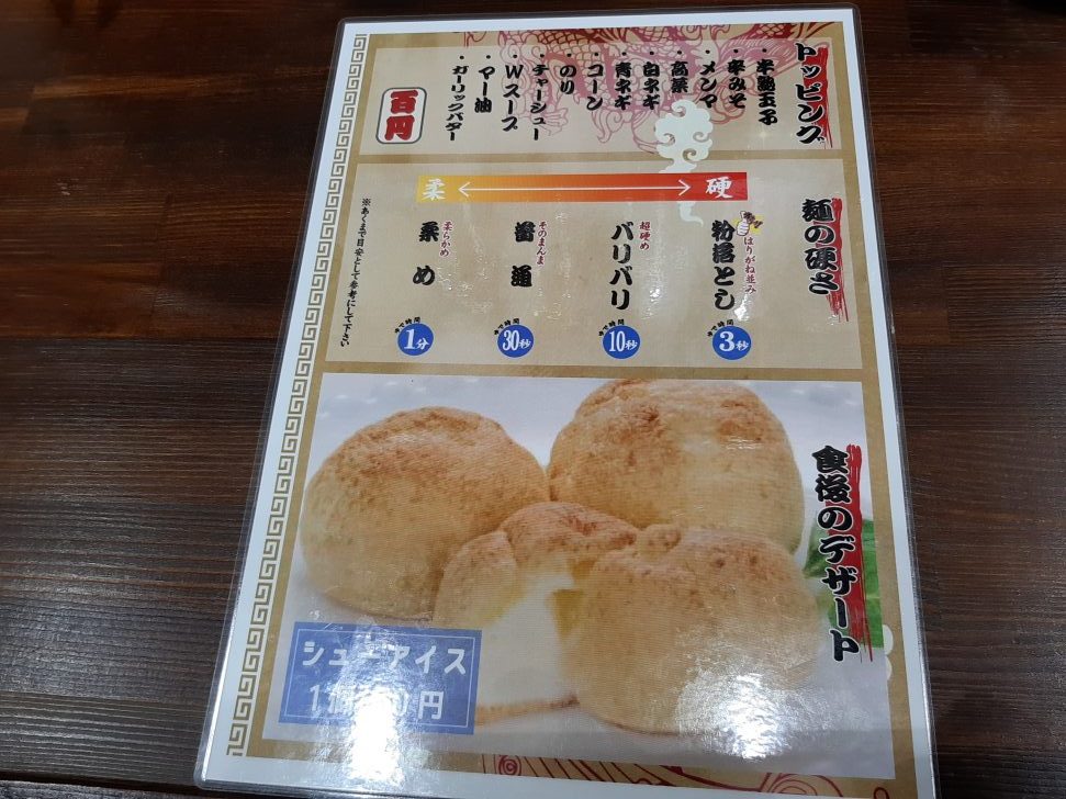 トッピングは全て一律100円のようです。久留米らーめんは、麺の硬さの言い方が違うんですね。バリカタと注文したら、バリバリですね言われました。食後のデザートとしてシューアイス(50円)がおすすめのようですね。