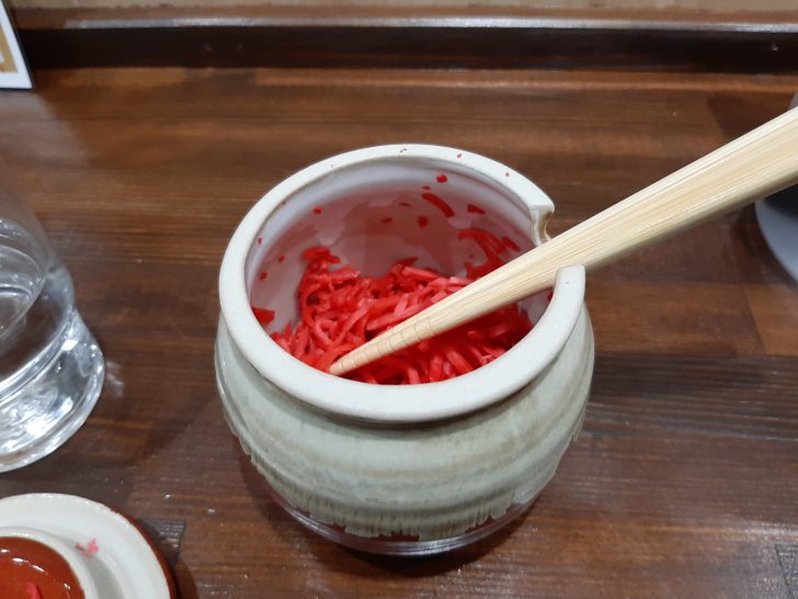 紅しょうがを入れました。卓上調味料としてニンニクもあったようですが、この時カウンター席にはありませんでしたね。