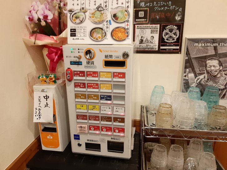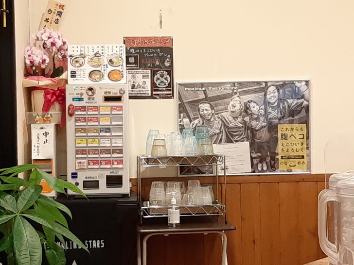 入店するとすぐ左側に食券の券売機があります。食券を購入して、店員さんに食券を渡したら、空いている席に座って下さいとのことだったので、カウンター席に座りました。しかしお冷が提供されなかったので、あれ?セルフサービス?のようです。券売機の横にコップがあり、カウンターにウォーターピッチャーがあります。セルフサービスのアナウンスはなかったように思いましたが、もしかしたら聞き洩らしたのかも知れません。お冷はセルフでお願いしますなどの表示があった方が良いと思いました。