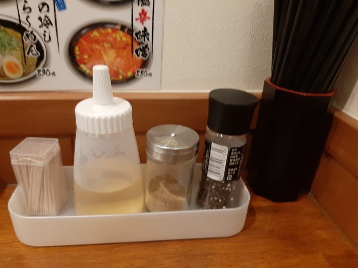 卓上調味料は、ホワイトペッパー、ブラックペッパー、酢でした。