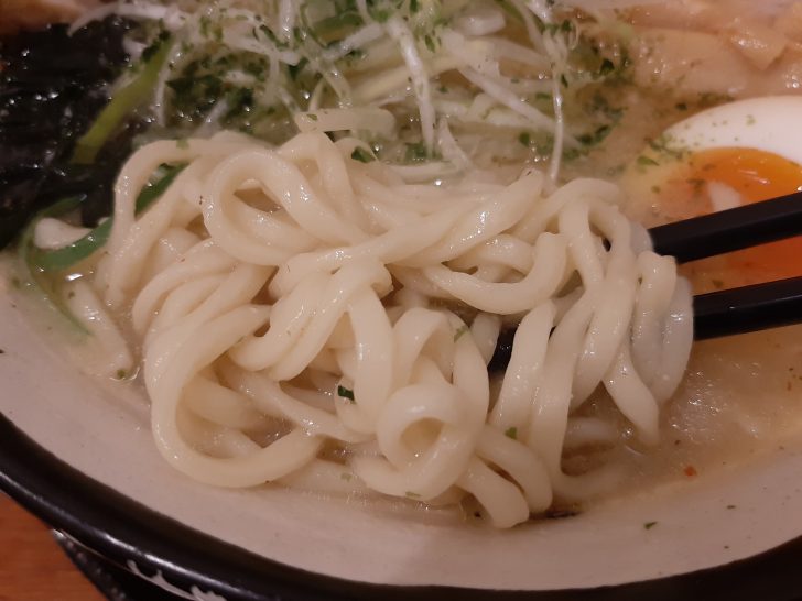 北海道産の小麦を使用した中太の多加水自家製麺は、コシがあり、もちもちしてスープへの相性バッチリの麺ですね。