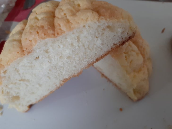 『ファミマ・ザ・メロンパン』は、製法を見直して、水分の吸収を抑える方法で作ることで、従来より硬くサックリと焼き上げた。また、表面の網目の大きさは、今までの約15mmから約23mmに変更。網目を大きくすることで凸凹感がより明確になり、食感が良くなったようです。表面のビスケット生地には、バターの産地として定評のあるフランス・ノルマンディー産の発酵バターを配合し、香りのよさを追求。隠し味にレモン果汁を加えることで、発酵バターの香りと相まって焼き菓子のような味わいを感じられるよう仕上げた。