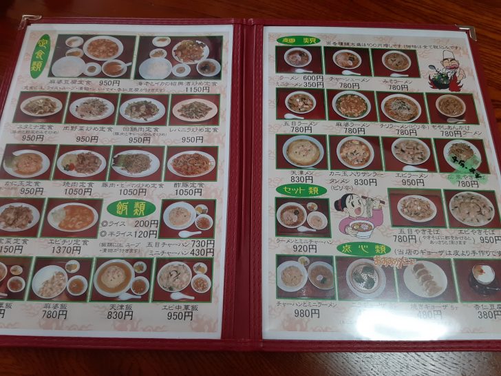 メニューには、定食類、飯類、麺類、セット類、点心類、一品料理、飲み物と一通りの中国料理メニューがありますね。