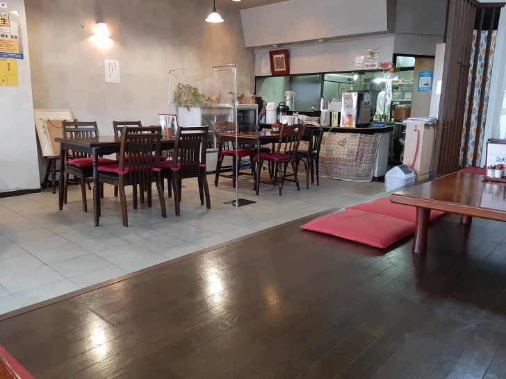 テーブル席は4人掛けが3つあります。コロナで席を減らしているようです。間隔が広い席はそのままですが、近い隣席とは仕切りがありました。コロナ対策も万全ですね。