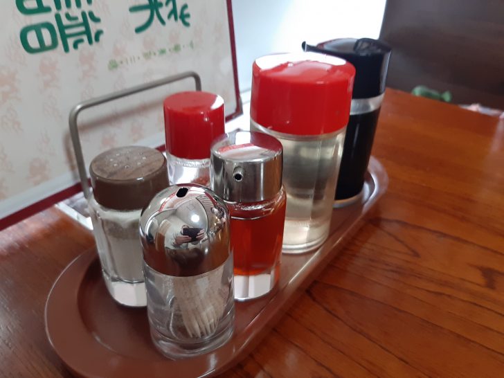 卓上調味料は、胡椒、唐辛子、醤油、ラー油、酢でした。