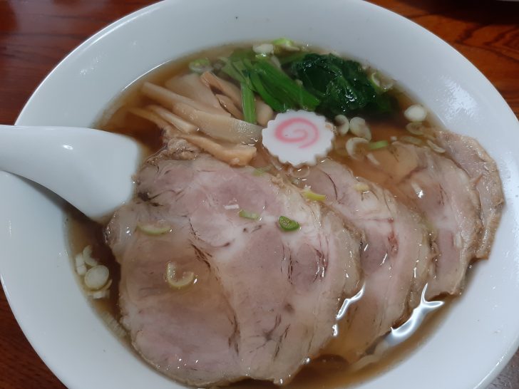 私が注文したのは、チャーシュー麺です。具材は、大きめで厚さもあるチャーシューが4枚、他にメンマ、ナルト、ホウレン草、ねぎなどが載っていました。