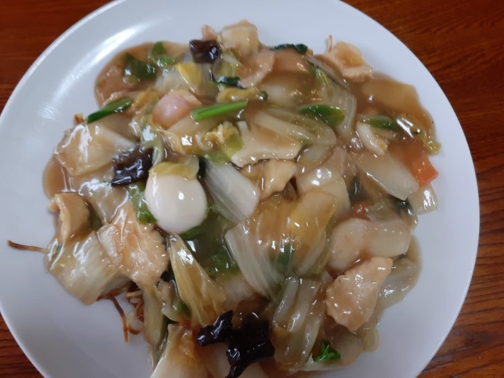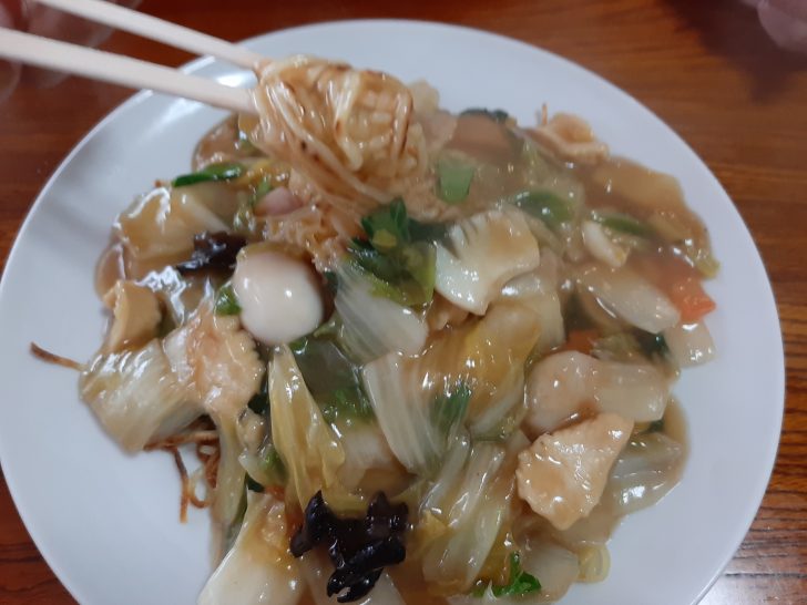 かみさんが注文したのは、五目焼きそばです。凄い具だくさんの餡かけやきそばですね。普通盛りなのですが、ボリューム満点で、味付けも良く美味しくいただけました。