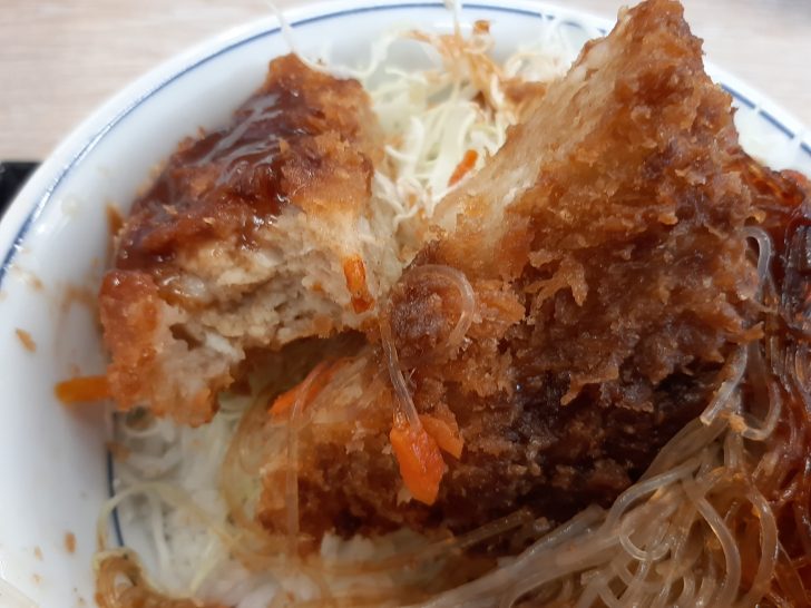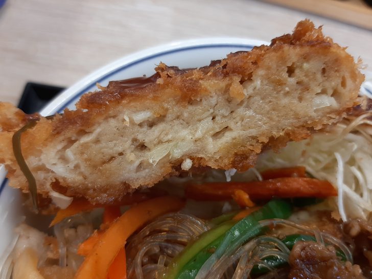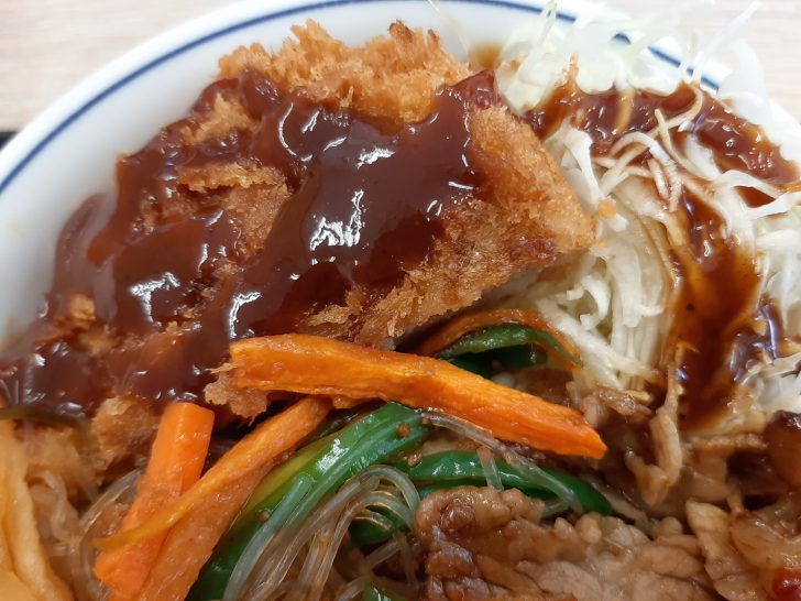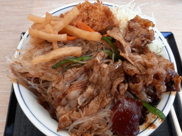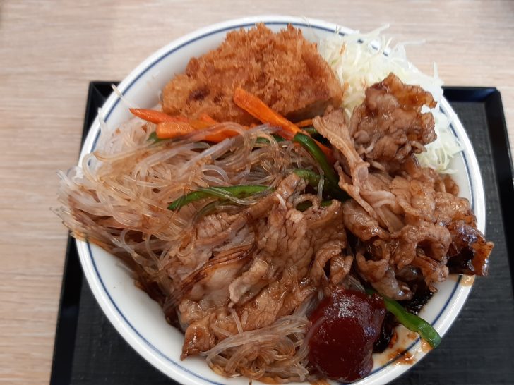期間限定の牛春雨プルコギメンチカツの合い盛り丼」ですが、揚物だけでなく、ヘルシーなプルコギが合い盛りになっていて美味しいので、私のような年配者には嬉しいメニューですね。皆様もぜひ一度食べてみて下さいね。