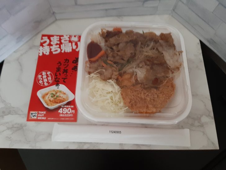 牛春雨プルコギメンチカツの合い盛り丼」の持ち帰り弁当もお店の丼と同じ感じで、美味しいと、言ってました。