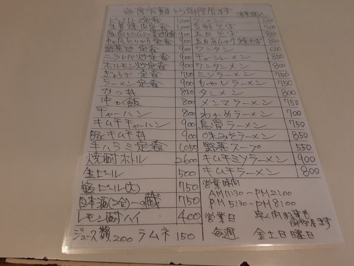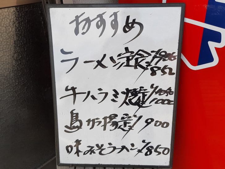 店頭に本日のおすすめメニューが、表示されていますが、ラーメン定食、牛ハラミ焼定食は通常価格より50円引きになっています。
