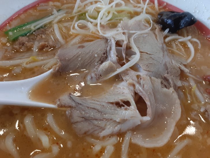 前回食べた三元豚チャーシューは、これまでの幸楽苑のチャーシューと異なり、しっかりした肉の味がして、さすが三元豚と思える美味しさが感じられましたし、サイズも大きかったです。しかし今回の『三元豚味噌らーめん』三元豚チャーシューは普通サイズが1枚しか入っていなくて、ペラペラの極薄なので、とても三元豚チャーシュー食べている気がしませんでした。
