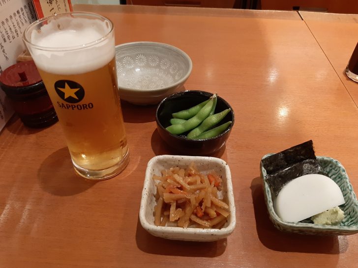 今日は、「ちょい飲みセット」を注文しました。ドリンクは、グラスビールにしました。おつまみの枝豆ときんぴらごぼう、板わさは、すぐに提供されました。天ぷら盛り合わせは少し時間が掛かるとのこと。