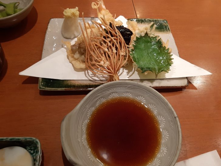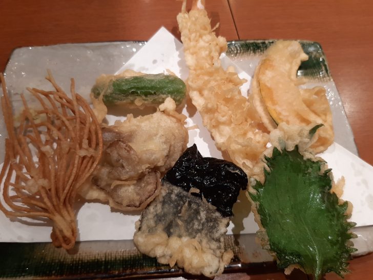 てんぷら盛合せの内容は、左から、そば、舞茸、シシトウ、海苔、海老、大葉、かぼちゃです。