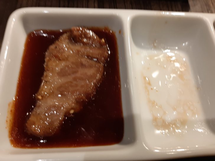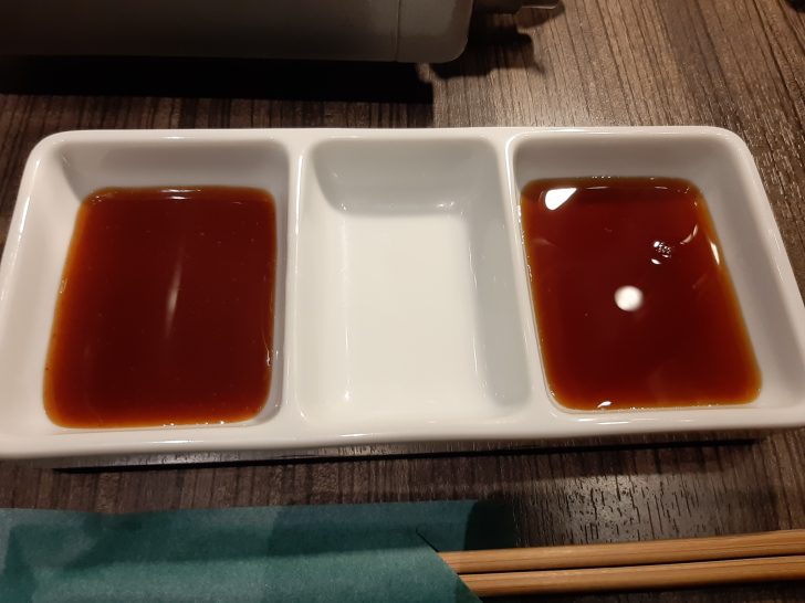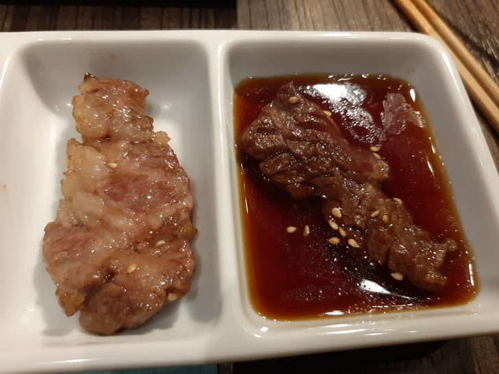 YAKINIKU 『WASABI』に行ったのは、日曜日ですが、WASABI Lunch Setを注文するつもりでした。そしてメニューを見たら、WASABI Lunch Setがなかったので、お店の方に聞いたら、平日だけということが、判明しました。他のお客さんもWASABI Lunch Setが休日にはないという事を知らずに注文していた方がいました。それで、仕方なく単品で注文しました。それにしても、メニューが少な過ぎますね。本当に焼肉屋?と思えました。とりあえず牛肉を注文することにしました。焼肉のたれは、右側が甘口、左側が辛口のようです。