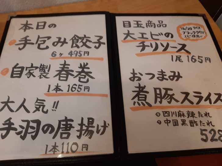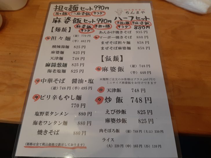 『大衆中華 ちんまや』のメニュー