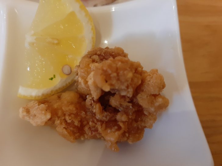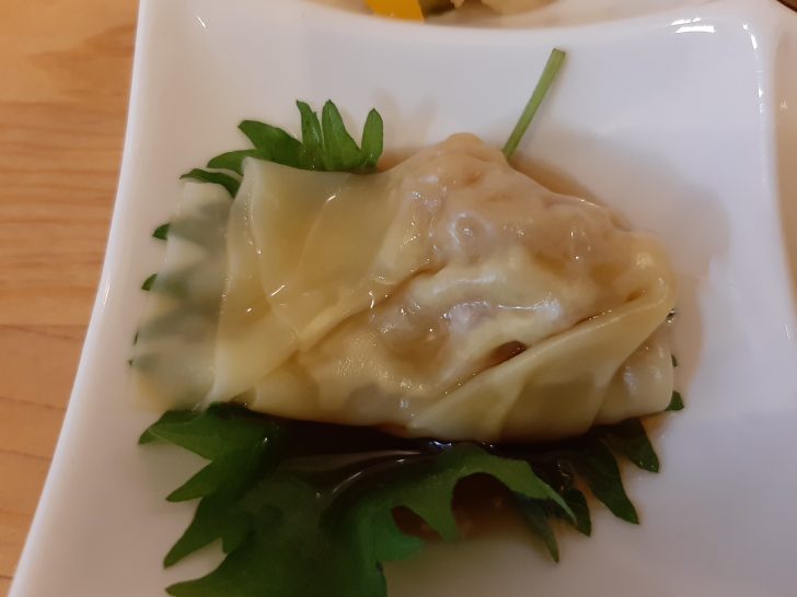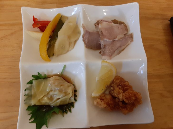 これが、気まぐれおつまみ4点盛です。左上から野菜のピクルス、チャーシューの切落し、タコの唐揚げ、肉ワンタンですね。中々美味しいおつまみですね。