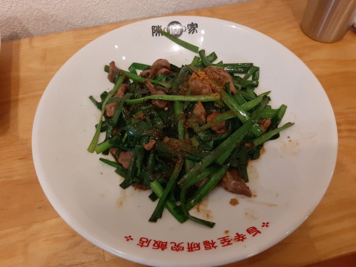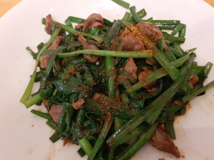 炒め物料理で注文したのは、『ニラと砂肝八香炒め』です。ニラのシャキシャキ食感と砂肝のコリコリ食感に香辛料が効いて美味しいです。ビールでも、ハイボールでもなんにでも合いそうです。