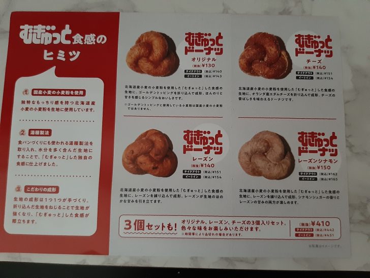 『むぎゅっとドーナツ』は4種類ありますが、それぞれ単品で販売されていますが、3個セットも販売されていました。3個セットの中身は(オリジナル、レーズン、チーズ)の3種類でしたが、4個セットにしなかったのは何故なんですかね?なので、レーズン シナモンは単品で購入するしかなかったですね。