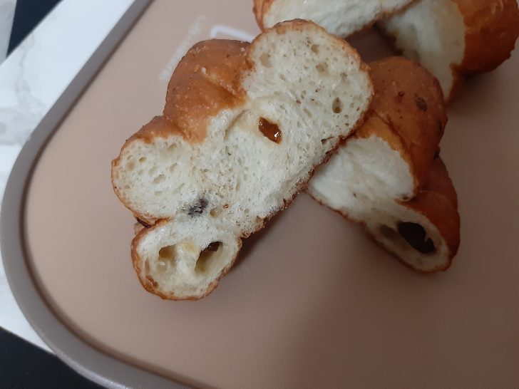 「レーズン」が煉り込んであり、普通のレーズンパンのように美味しいです。
