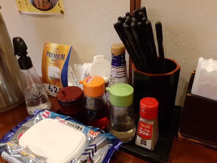 卓上調味料は、醤油、胡麻、唐辛子、ラー油、酢、胡椒ですね。更にコロナ感染防止用に消毒用アルコールやウエットティッシュが置いてありました。