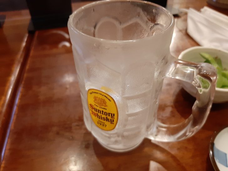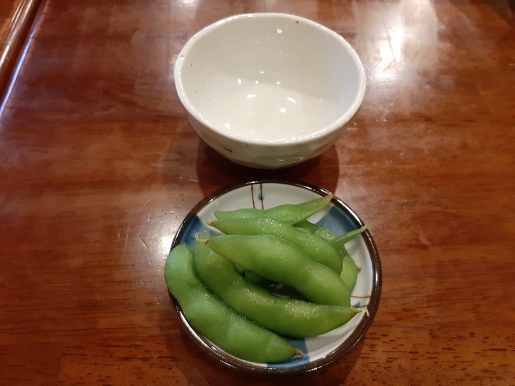まずはお目当ての「ほろ酔いセット」を注文しました。「ほろ酔いセット」は、料理5品とドリンクのセットです。ドリンクは、生ビール、焼酎、日本酒は1杯で、ハイボールは2杯です。当然ハイボールを注文しました。料理は、まず枝豆が提供されました。