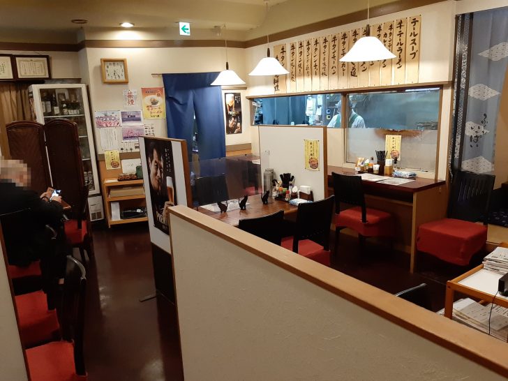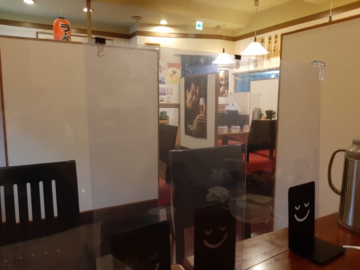 店内のテーブル席は、高めのパーティションで区切られているので、半個室のような感じで、利用できるので、4人程度でランチや飲み会をするのに丁度良いですね。更にテーブルには向いの席との仕切りのアクリル板も設置されているので、コロナ対策も万全ですね。