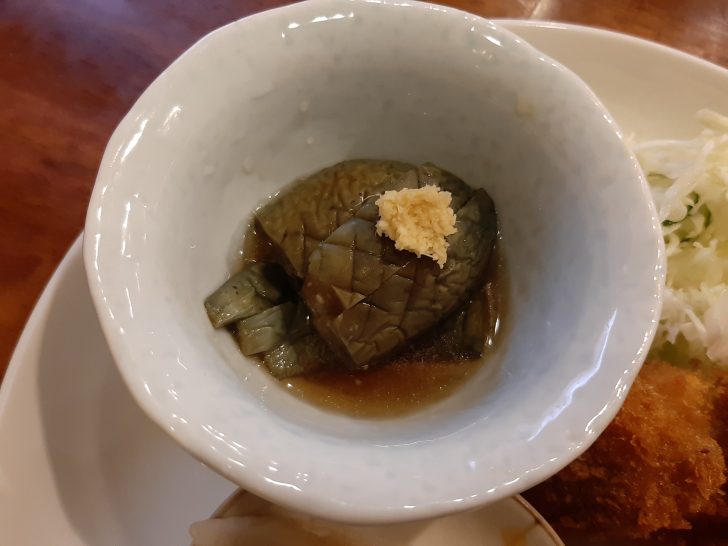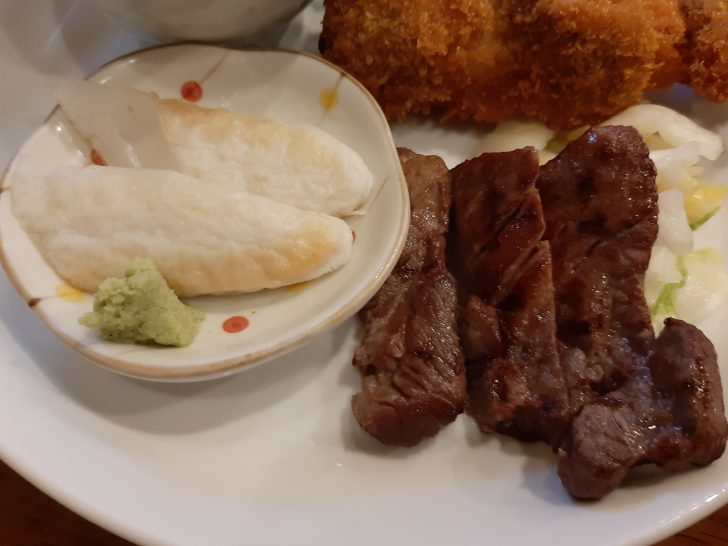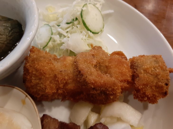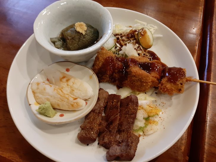 次に一皿に、牛タン焼き3切(白菜漬け付)、牛テール串カツ(野菜付)、笹かまぼこ、なすの煮びだしが、盛られて提供されました。牛タン焼きと牛タン串カツと牛タン料理が2品も食べれるのは良いですね。セットで1350円(税込)はお得ですよね。