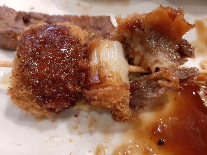 牛テール串カツというものを初めてたべましたが、牛テール肉がほろほろと柔らかく、ネギ間となっていて美味しいです。